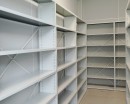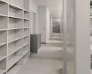 Максимальное использование пространства за счёт стационарных стеллажей вдоль стен и в центре помещения.