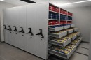 Передвижные стеллажи оставляют всего один рабочий проход, а всё остальное пространство превращают в полезную площадь склада.