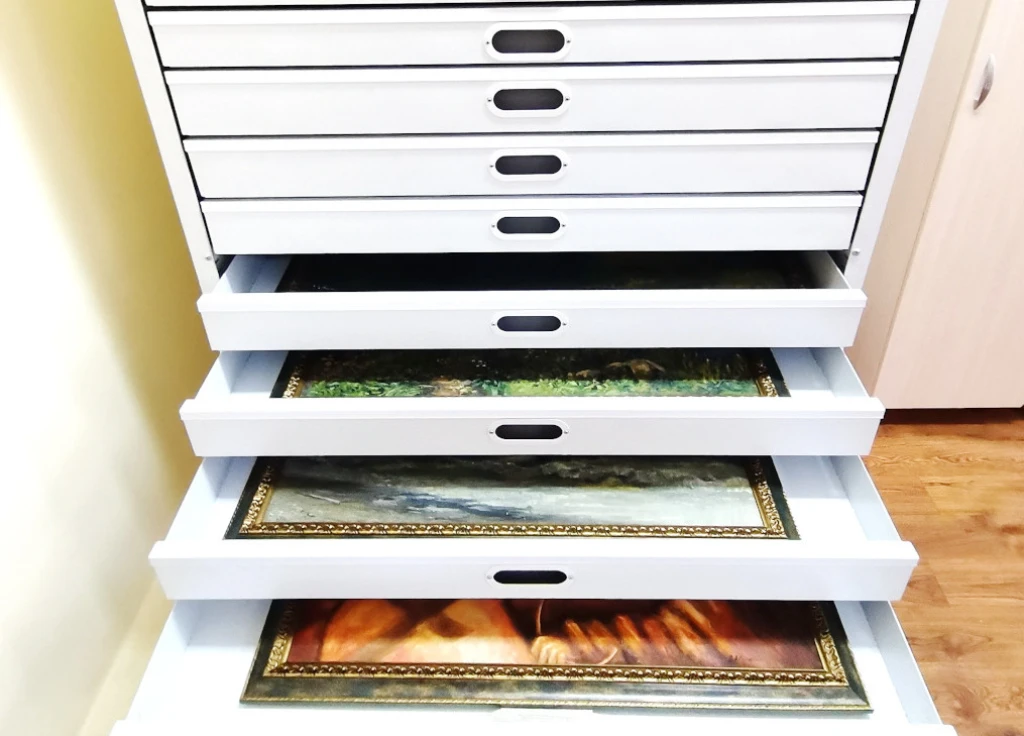Сегодня наиболее эффективной системой для бережного и безопасного хранения художественных произведений в музее считаются мобильные стеллажи для картин и холстов. Металлические стеллажи с двусторонними сетками предназначены для удобного вертикального хранения картин, икон и других предметов живописи. Они вместительны и компактны, за счет своей технологии экономят ценное пространство помещения.