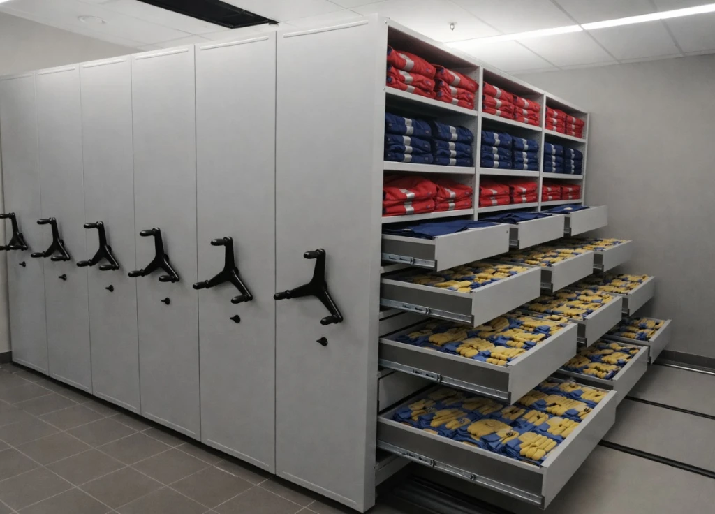 Среднегрузовые передвижные стеллажи закрывающиеся дверями жалюзи для склада и других по назначению помещений.